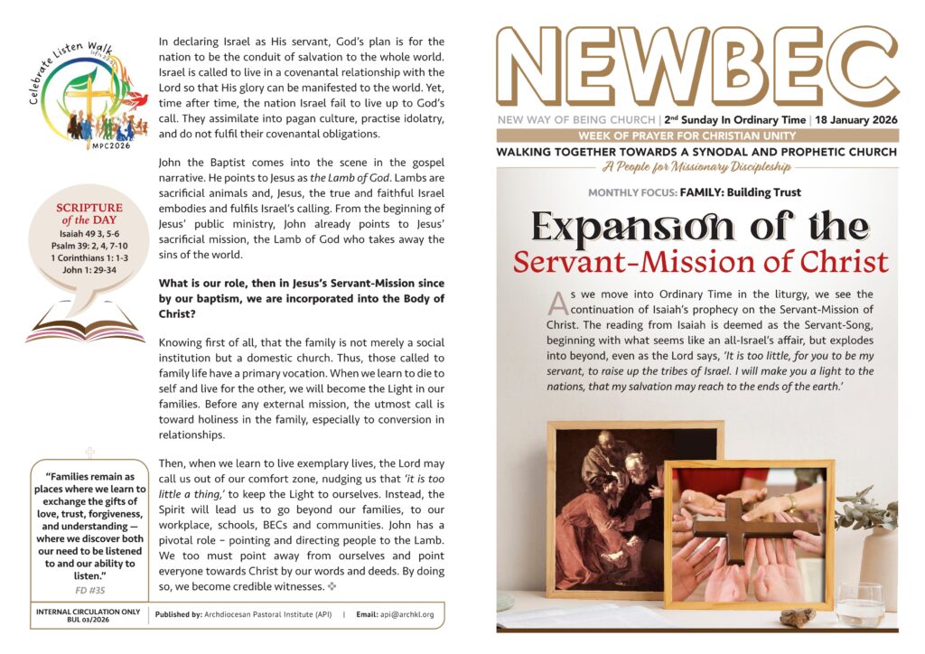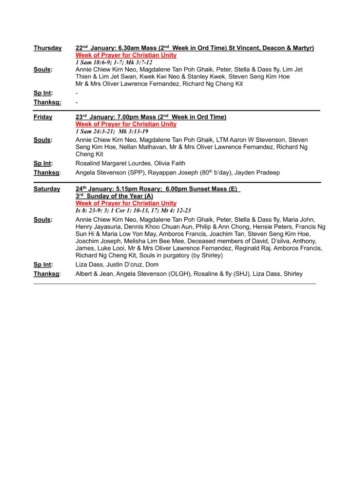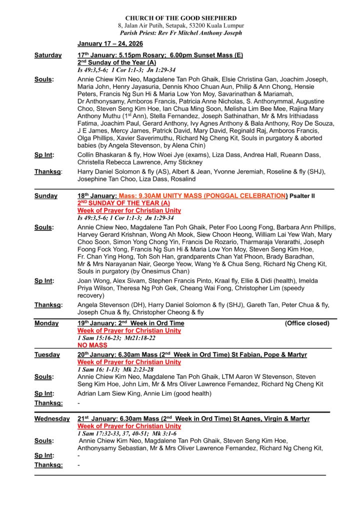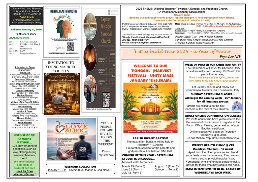 Church Bulletin – 18th Jan Till 24th Jan 2026 By admin | January 16, 2026 Bulletin (E) January 18Download Share this: Click to share on Facebook (Opens in new window) Facebook Click to share on X (Opens in new window) X Posted in Church Bulletin