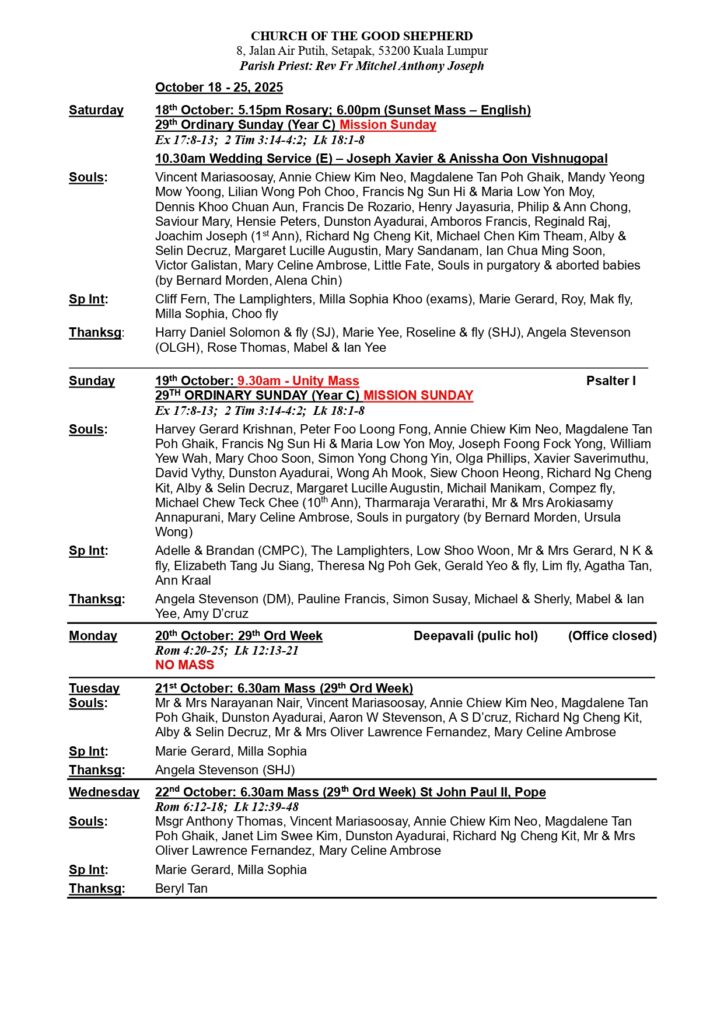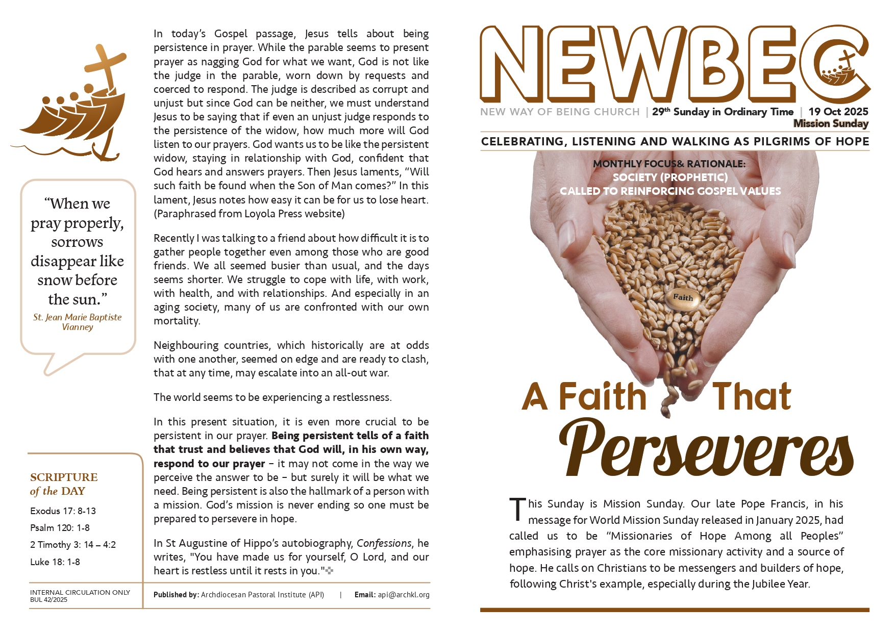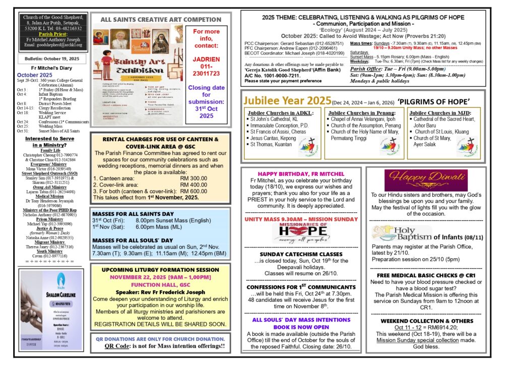 Church Bulletin – 19th Oct Till 25th Oct 2025 By admin | October 17, 2025 Bulletin (E) October 19Download Share this: Click to share on Facebook (Opens in new window) Facebook Click to share on X (Opens in new window) X Posted in Church Bulletin